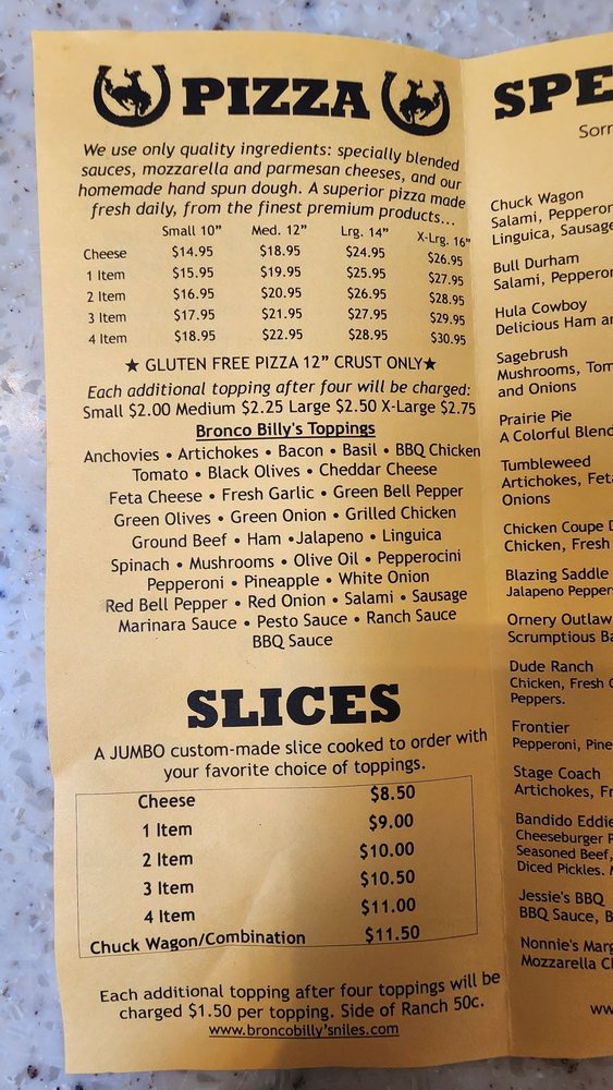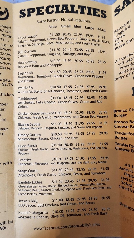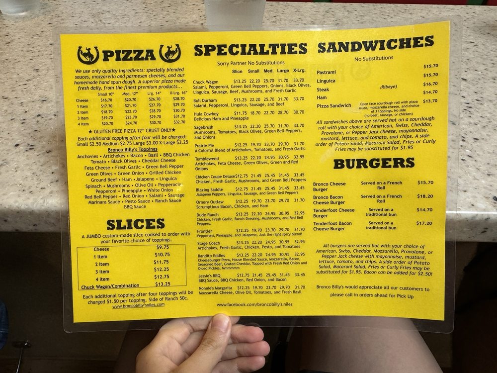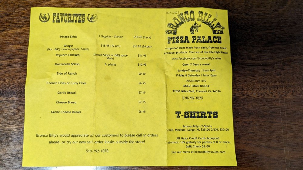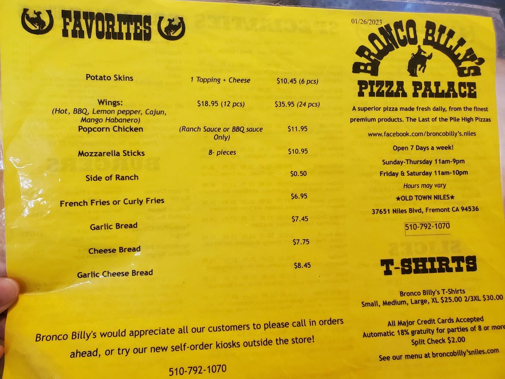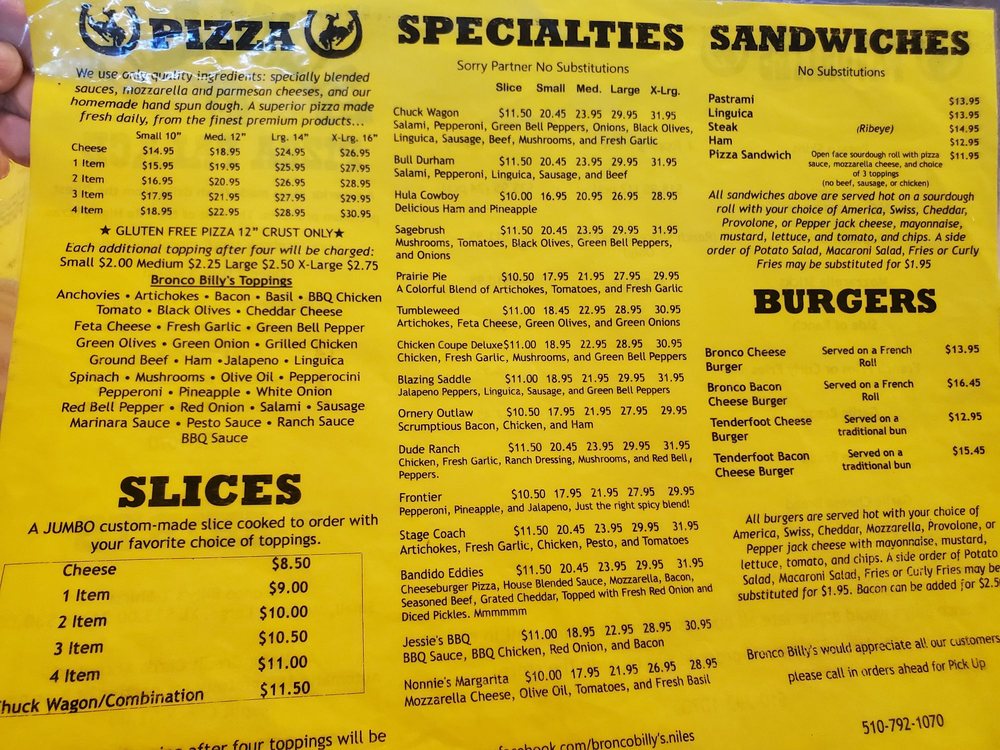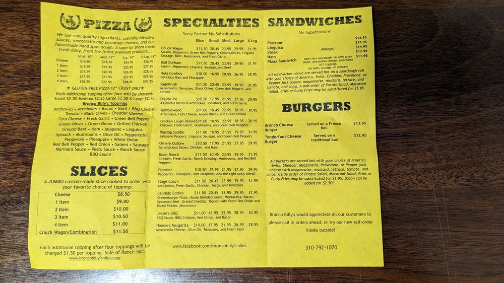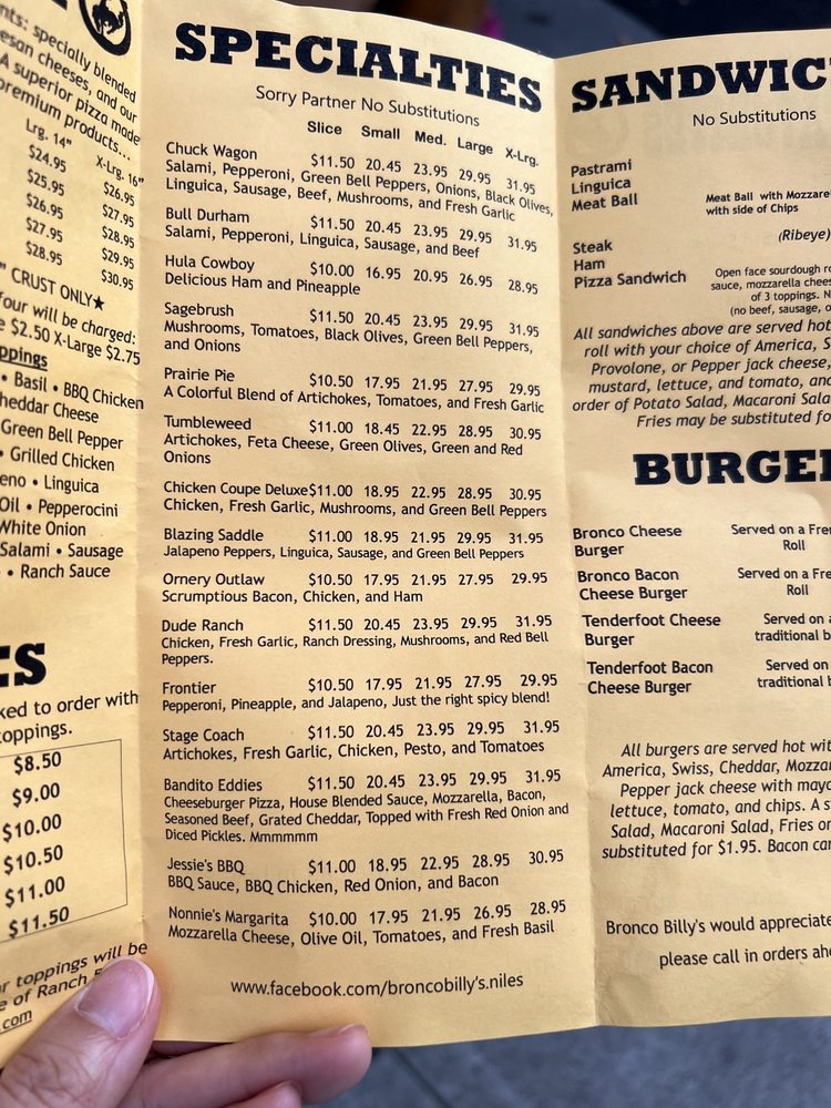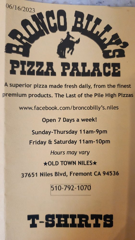 Bronco Billy’s Pizza Niles, located at 37651 Niles Blvd in Fremont, CA, offers a wide range of pizzas in various sizes. From small cheese pizzas to specialty slices like the Chuck Wagon with a variety of toppings, there is something for everyone. Customers rave about the fresh and delicious ingredients, with reviews highlighting the amazing pepperoni slices and the unique Jessie's BBQ & Frontier combo. The casual and laid-back ambiance, along with friendly customer service, adds to the overall dining experience. With options for takeout, delivery, and catering, Bronco Billy’s Pizza Niles is a must-try for pizza lovers in the area. Don't miss out on the opportunity to enjoy a slice of their humongous, hot, and crispy pizza that keeps customers coming back for more.